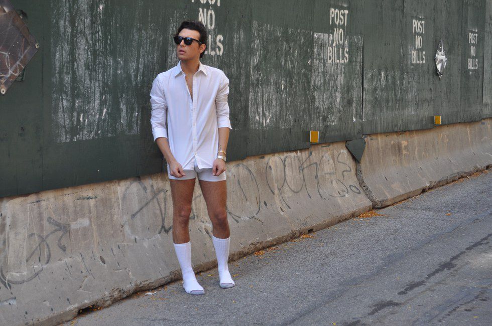 Channel your inner Tom Cruise with a white button down, boxers, socks, and ray bans.