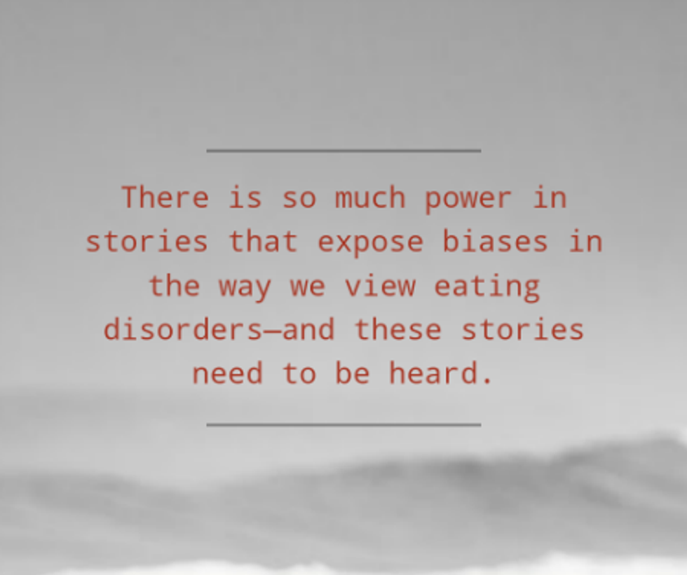 The stereotype of looking like an emaciated skeleton or sticking two fingers down one's throat isn't a qualifier for being someone who struggles with ED. As of 2013, the DSM-V diagnoses include anorexia nervous, bulimia nervous, binge eating disorder, EDNOS (Eating Disorder Not Otherwise Specified) and Unspecified Feeding or Eating Disorder.