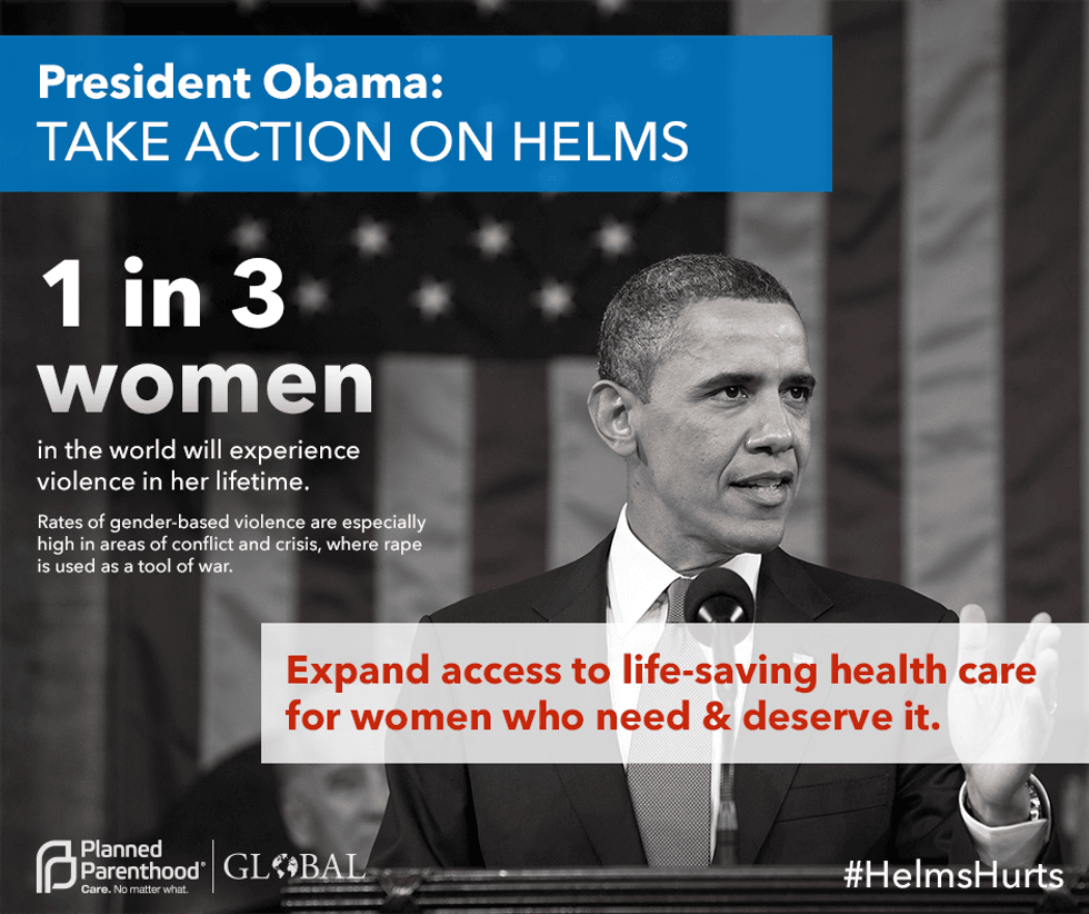 All of the above problems could be solved by a simple fix. The reinterpretation of a policy that was meant to protect women abroad. If you are appalled by the treatment of women, tell President Obama to reinterpret the Helms Amendment. As the executor of the laws of the nation he would be responsible for the reinterpretation of the Helms Amendment. Women have a right to abortion care especially in cases of rape, incest, and when their lives are in danger. Stand up for women and learn more about how Helms hurts here.