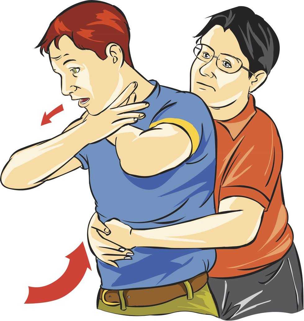 Stepping behind the choking victim, the Heimlich Maneuver can then be performed by taking the fist and thumb of your dominant hand below the ribs and diaphragm and wrapping that into your other hand. One should move said thumb upward and into the abdomen of the person choking. Applied force has a very prominent chance of pushing the obstruction from the airway with repeated thrusting movements. Do not be afraid to thrust with gusto!