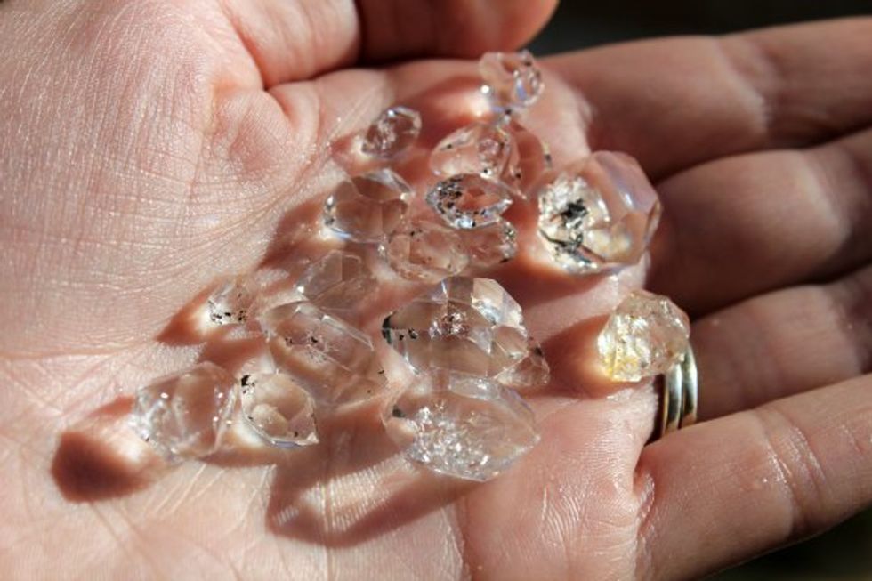 That’s exactly what we were experiencing as we realized that the rock we had split open was filled with Herkimer diamonds, varying in size from smaller than a piece of rice to larger than a peanut. Taking to our chisels and hammers, we sat crouched over at the base of a pile of dolomite stones that were just waiting to be cracked open and started to work on chipping away at our crystal treasures. Sweat dripped down our arms and legs, attracting pesky gnats and adhering a thin layer of dust to our skin, but we showed no care—how could we when were too busy oohing and ahhing at our rapidly growing collection of radiant diamonds!