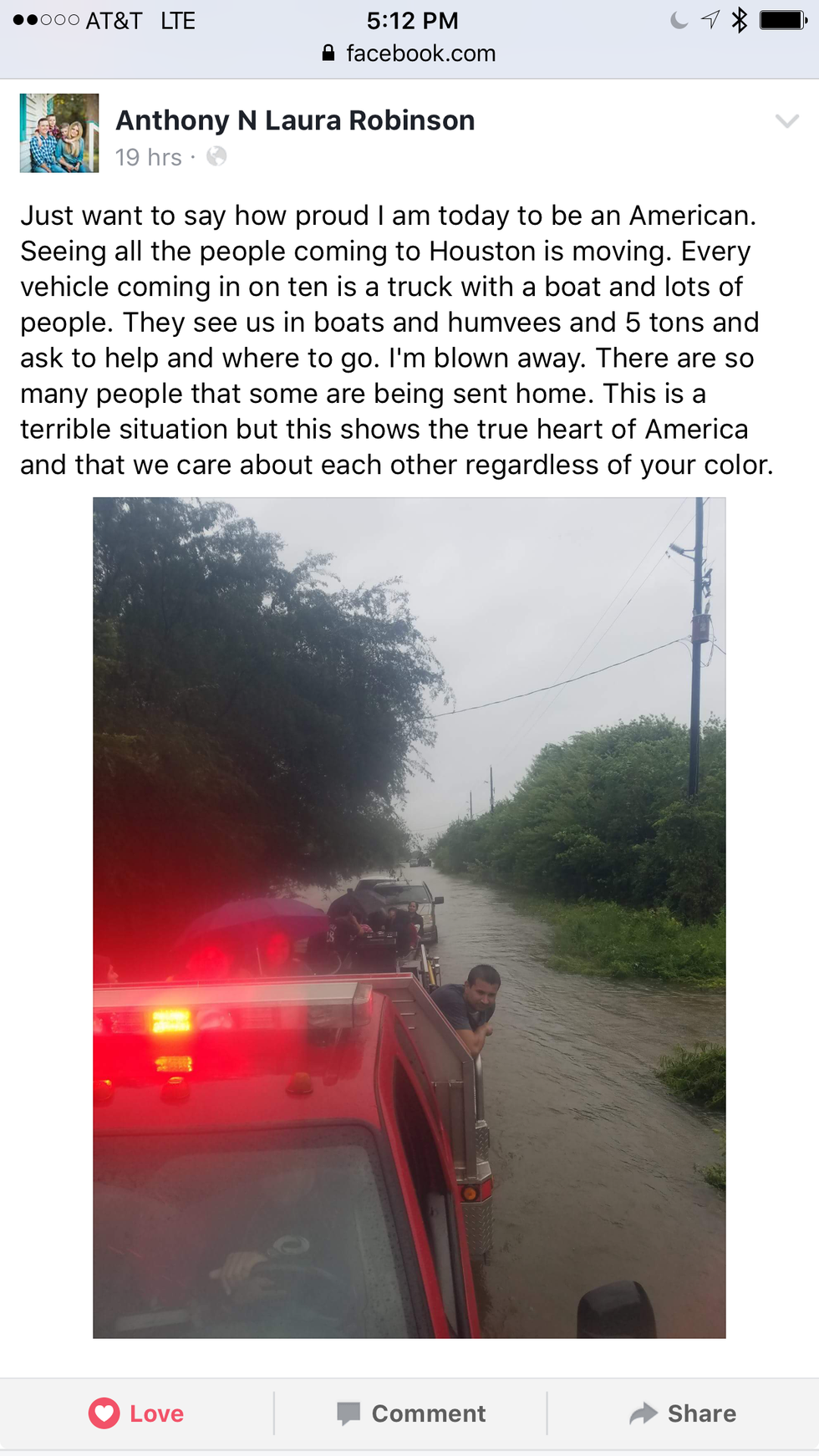 I have friends in the Houston area who are driving to shelters daily to take people food and clothes. They are collecting from others who want to help as well. We have a friend who is a Air Force Veteran and former Pararescueman who is on the ground day after day VOLUNTEERING his medical expertise and ability to perform rescues anywhere he can be used. One of my Trades of Hope sisters is donating her sales commissions to relief efforts (Which I'm going to do as well since she inspired me!). I just love these people and their sacrificial love for other Americans they don't even know.