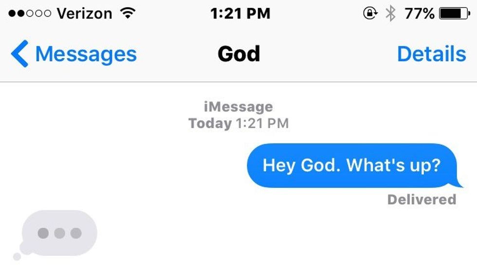 “Hey God. What’s up? I don’t know why, but it’s weird praying. It’s like I’m talking to myself, but I’m not. Then I stop and realize, 'Wait, this should be more formal. I’m talking to God.' Shoot… I’m doing it again. Let me start over…"