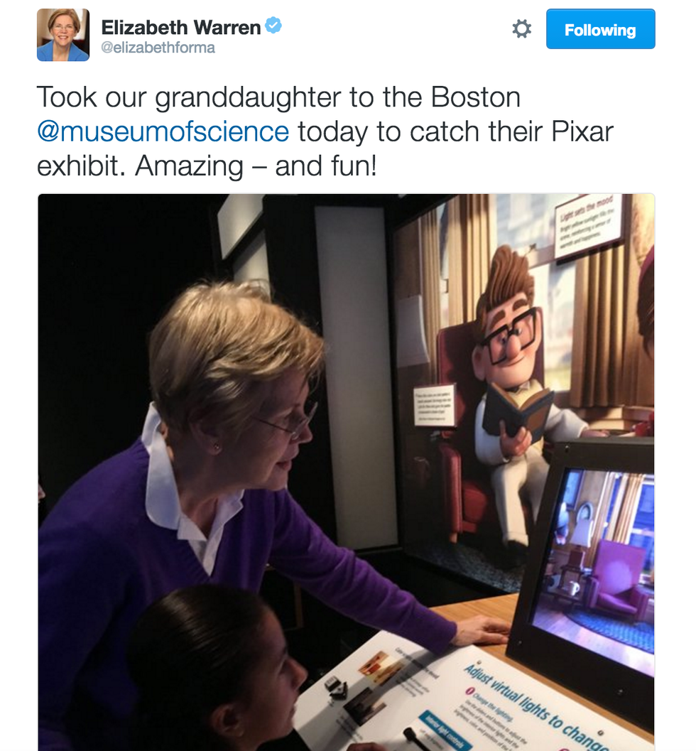 Last week, Warren posted this adorable picture and caption to celebrate her husband's birthday. A week earlier, she shared that she took her grand daughter to the Boston Museum of Science!