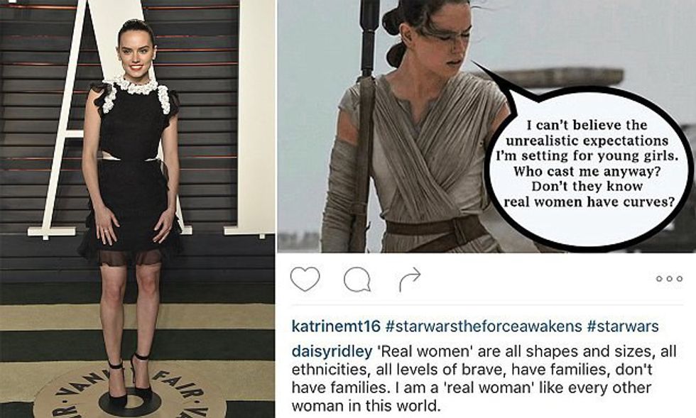 While it’s great that Daisy Ridley stood up for herself and for “real women” everywhere, we can’t ignore the fact that this should have never even occurred. I applaud her for recognizing that she doesn’t need to apologize for how she looks, but I would love to know where she thinks she’s “stumbling”." Rey is a strong, revolutionary character that countless women can relate to and can see hope in. Ridley, as an actress, is no different. It’s great that this generation is gaining a strong role model who can demonstrate how to maturely shut down bullies while still exemplifying a beautiful sense of confidence.