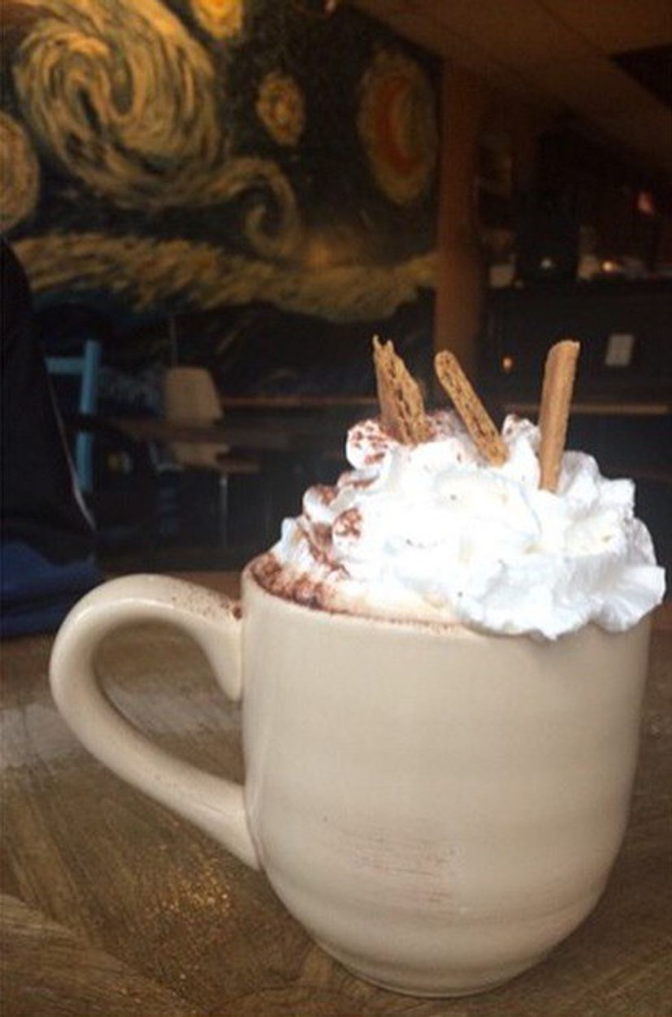 From enjoying an exotic flavored latte like S'mores or Banana 'Nilla to trying your first vegan wrap, this cafe has it all. There's a giant mural of Van Gogh's infamous starry night that helps set the mood. Whether you're sitting at a candle lit table or lounging in an arm chair with a book, you'll be sure to hear the live music that plays there often.