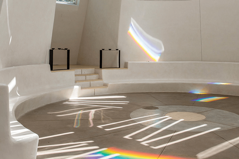This calm and meditative room was created by Virginia Dwan and consists of a simple layout. Prisms detail the walls and roofs in order to cast a rainbow-esque aura about the room. Head down to Las Vegas, New Mexico, to experience the stunning, peaceful architecture of this room.