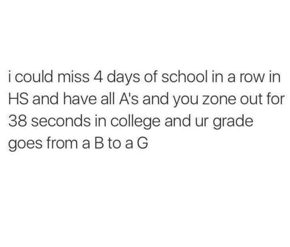 After being in college for a few semesters, I realized that your typical college movies that are produced on TV didn't showcase any of the struggles that were soon to come in college. Studying in high school was almost nonexistent except for those few classes that required a few extra hours of work, which was definitely not often. Most college nights are spent staying up late, and sometimes pulling all-nighters to study for tests that you didn't previously have enough time to study for throughout the week because of other demanding class assignments. In high school, I was in bed by 10 every night during the week and actually had time to relax, so these long nights of cramming my brain with tons of information hit me pretty hard.