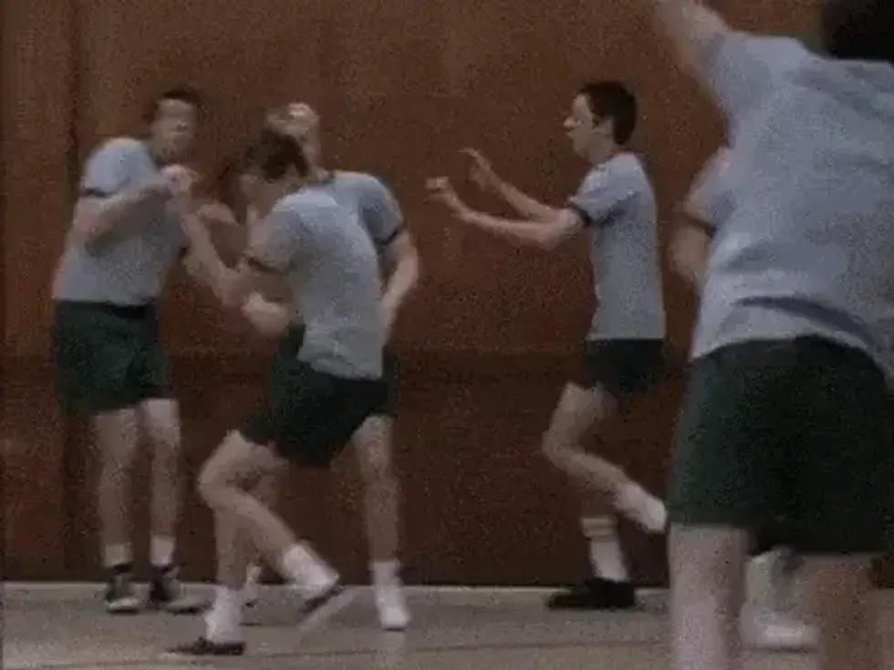 In my high school gym class consisted of an excessive amount of time changing into and from our gym clothes and a short amount of time spent playing sports. On T.V. and in movies gym uniforms are a thing and 99% of the time they're seen playing dodge ball. Also, what is with the whole climbing the rope thing in gym?