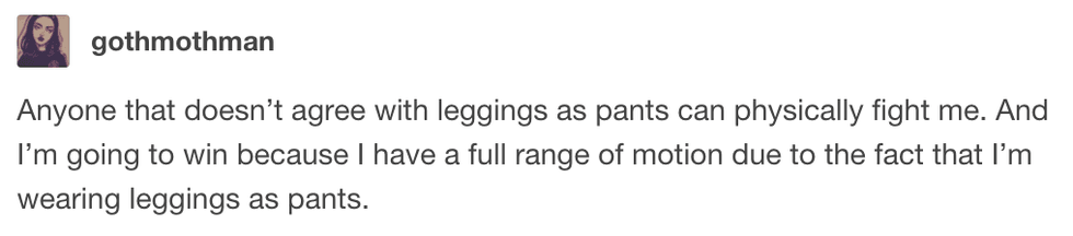 My feelings on leggings as pants are pretty easily summed up by this handy Tumblr post: