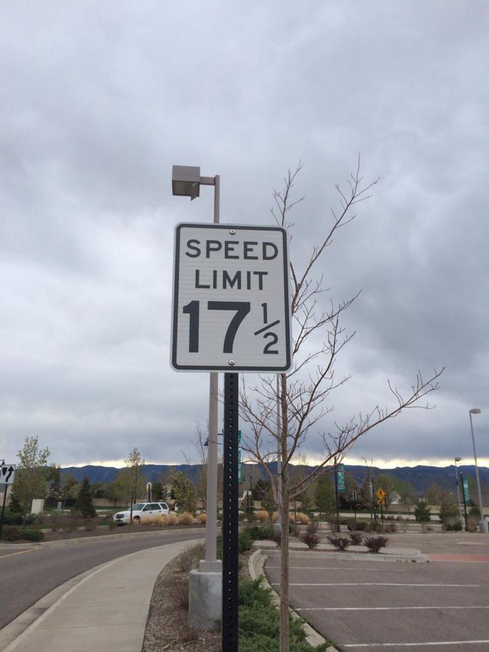 Note: Yes these are actual pictures of speed limits in Highlands Ranch. The 12 1/2 is posted in Town Center and the 17 1/2 is posted in the Super Target parking lot across the street from Town Center.
