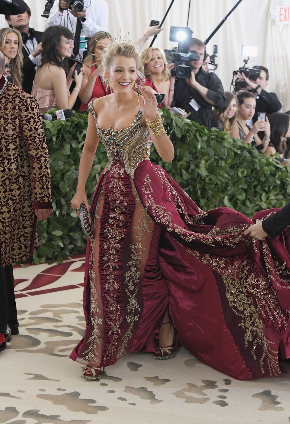Blake Lively in Atelier Versace, Christian Louboutin shoes, and Lorraine Schwartz jewelry with a Judith Leiber Couture bag.