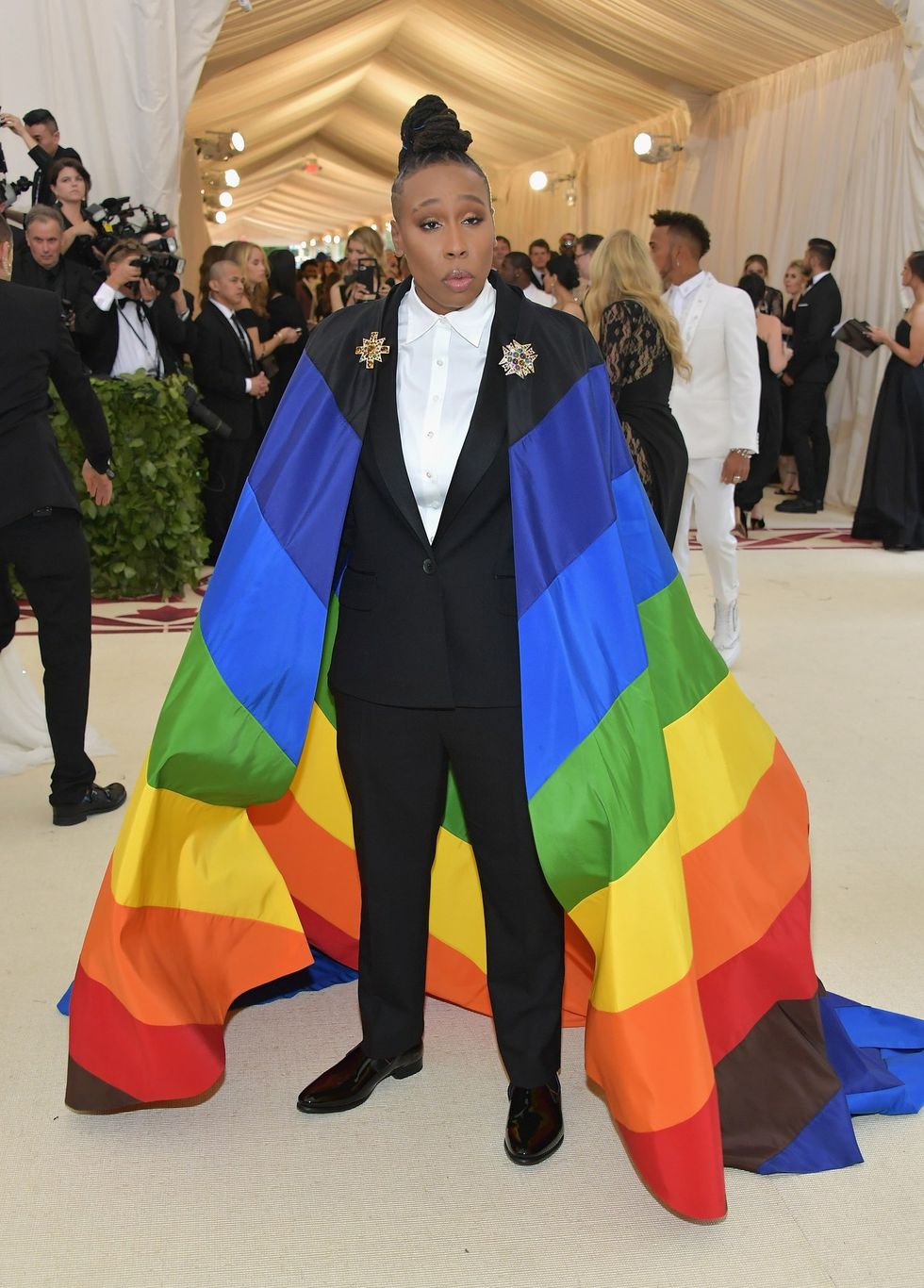 Representing the LGBT community in contrast to the opposed Catholic religion, Lena Waithe chose a rainbow cape overtop a Carolina Herrera suit.