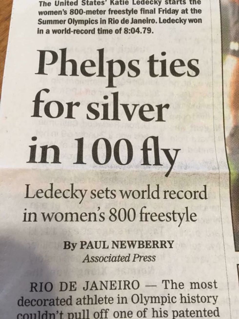 1. After winning gold and breaking a world record, Katie Ledecky's name appeared under Micheal Phelp's in a headline after he won silver.