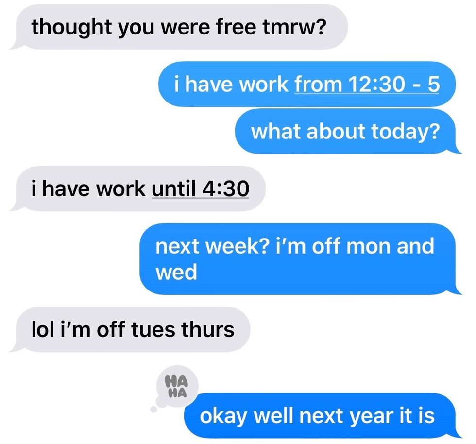 Whenever I would text my friends to try to make plans, our schedules would always somehow clash. And if we did manage to find a time to do something, we were, more often than not, so tired that sleep seemed more appealing than anything else.