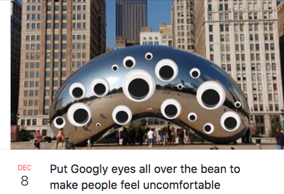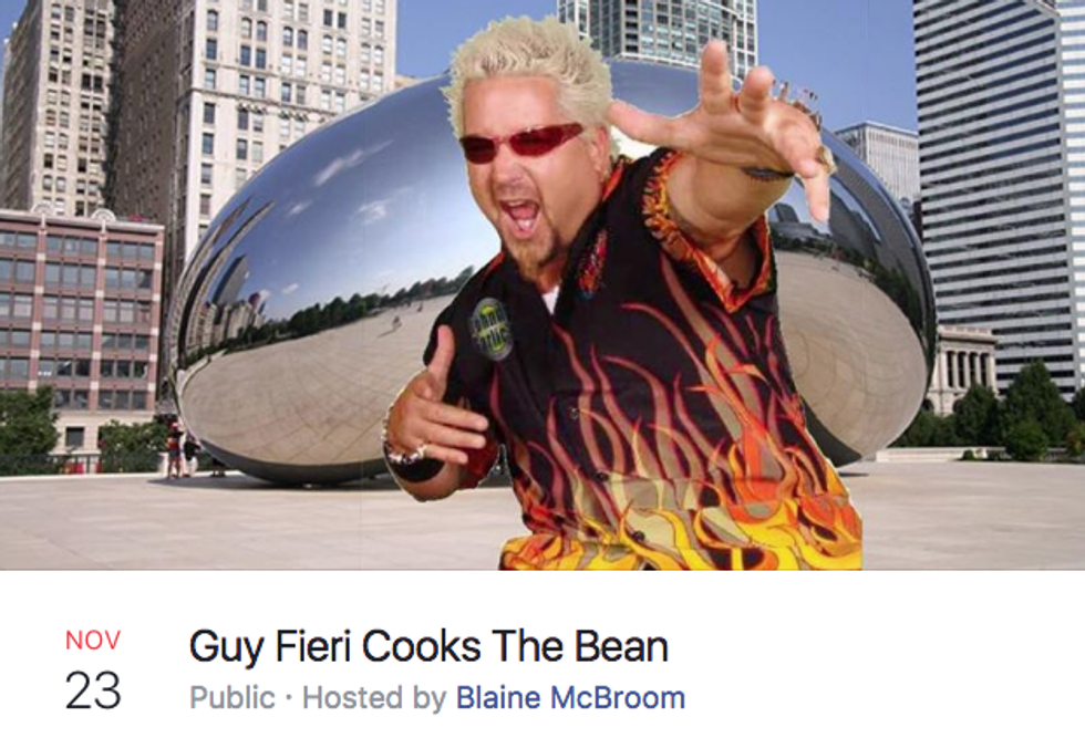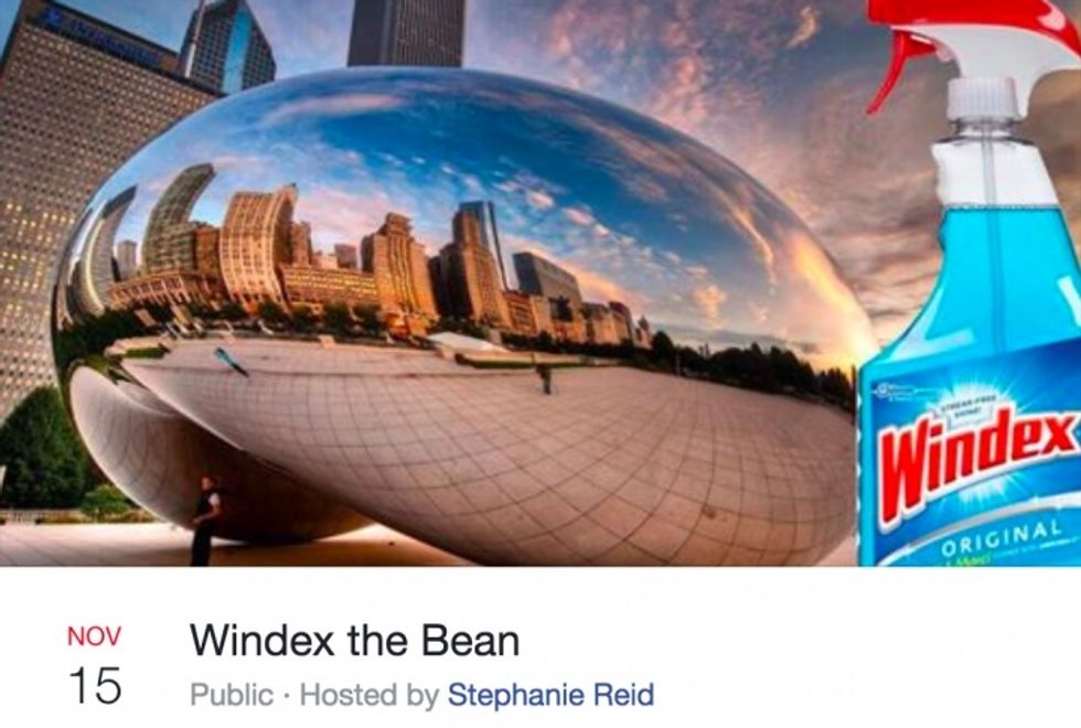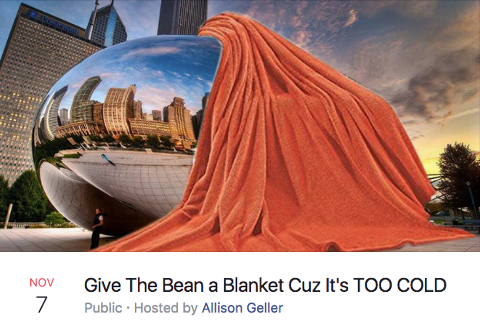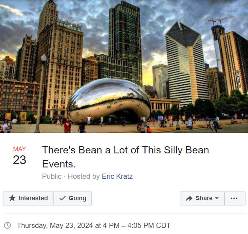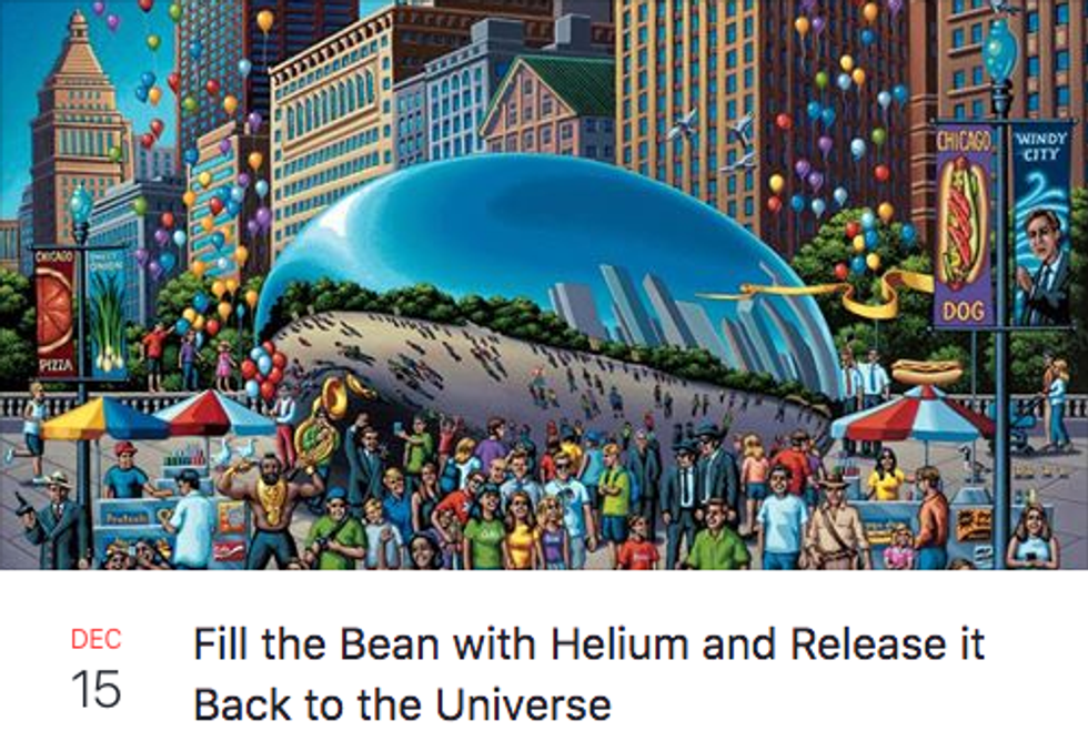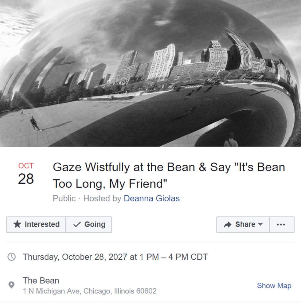 The Cloud Gate sculpture , more commonly known as The Bean, is a staple of the Chicago experience... at least that's what I tell all of my out-of-state friends when they come to visit. Who doesn't love getting your tourist friends to take embarrassing pictures with the random, metallic bean in our city center? I am not the only one who has noticed and commented on the Bean's beautiful absurdity. There is a thread of "memes" on Facebook where Chicagoans make fake events around or involving the Bean. Stay tuned for this list to see some highlights.
