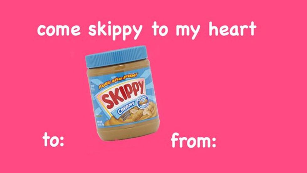 Come skippy to my heart. Just like the pizza card, who doesn't like Peanut Butter! So pass this one on; your Valentine is sure to "skip" right to your heart!