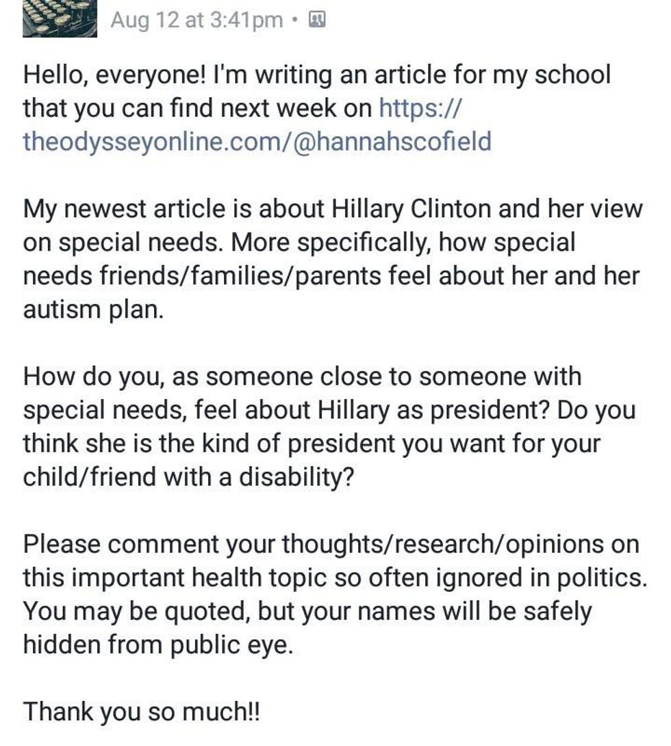 Believe it or not, Age of Autism's post was the only one I could find talking about what special needs citizens or their families thought about how Hillary's plan or her presidency.