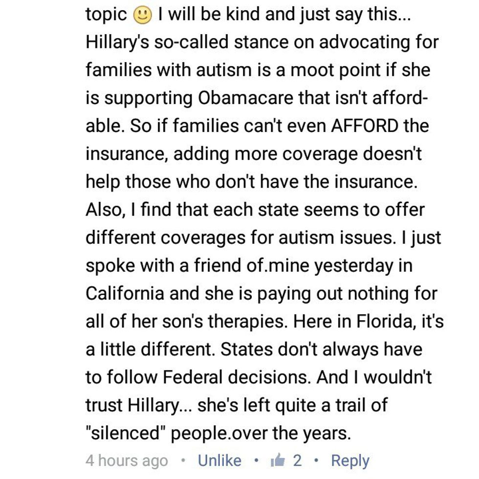 "She brought up autism on the national level, but she did that during an election year. Did she bring up it as a stepping stone? Is Hillary talking about autism for her own gain? Because after reading her mediocre plan, that’s exactly what it feels like she’s doing."