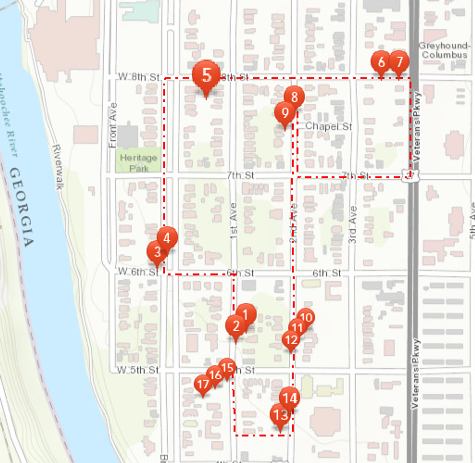 Built more than a hundred years ago and detailed in the 1900 Sanborn Fire Insurance Maps of Columbus, the following homes are fine examples of shotgun houses. The tour path, below, around the Historic District in Columbus, Georgia, is roughly one and three fourths of a mile in length and takes a little more than a half hour to walk.