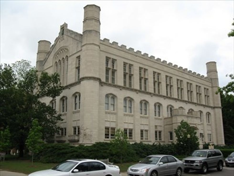 Look at the tree on the left, and then the four slim windows, go up to the middle of the building where it comes to a point. There's an owl there. Owl's at OU represent the law program. Monnett Hall used to be the law building before OU built a newer and bigger building on the south side of campus.