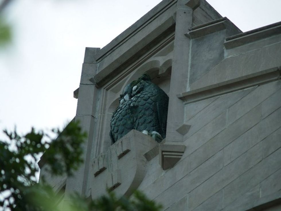 Rumor has it that past students had a lot of rivalry in the law program (since this used to be the old law building) and one night they climbed to the top of the building to paint the owl. I'm not 100% sure of the rest of the story and I couldn't find it on Google but I do remember that the first time I toured the campus, the owl was mentioned.