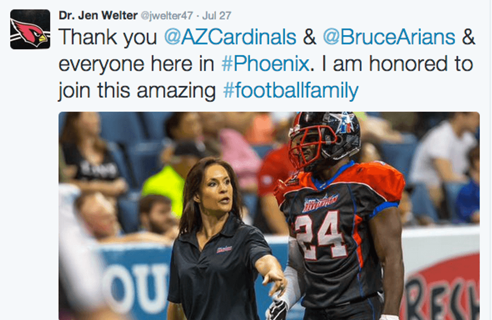 Talk about girl power! Welter is paving the way for women in this male dominated sport. Who says girls can't be strong, tough, in charge or talk about sports? It's about time women are able to follow their "impossible" dreams! With Welter leading the way for the Cardinals, I would not be surprised to see more women holding positions in the NFL. Like Welter said in her Twitter post, "Every woman can walk a little taller. Every girl can dream a little bigger."