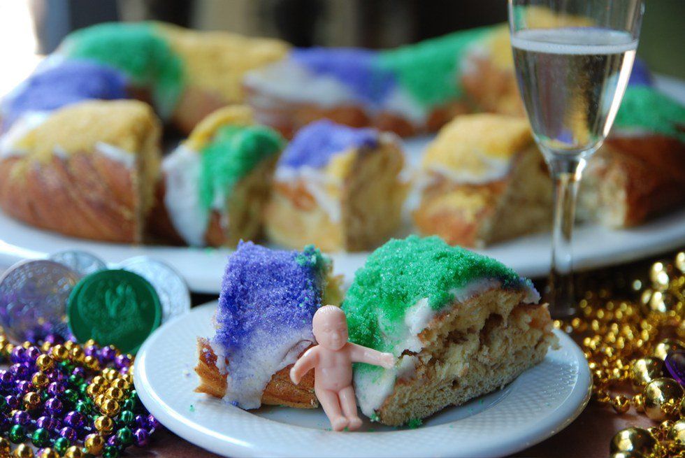 Today, our king cakes are sweet, cinnamon roll-like, oval shaped cakes decorated with purple, green, and gold sugar and icing. Three colors were chosen because there were three wise men and these colors were meant to resemble a jeweled crown like the three wise men wore. The color purple represents justice, green represents faith, and gold represents power. There is a single plastic baby Jesus hidden in each king cake. Since New Orleans is a heavily Christian-oriented city, the baby Jesus is a celebration of the Christian faith. This tradition has people all over the city searching for the baby in the cakes just like the wise men searched for Jesus in biblical times. Traditionally, New Orleanians throw king cake parties. The person who finds the baby in the cake is required to throw the next king cake party and buy the next king cake. People also bring these cakes to work, school, or community events where the lucky person who gets the baby is required to buy and bring the next king cake. Because of this tradition, King Cake often becomes a daily or weekly treat in offices, communities, and families all Carnival season long. Best tradition ever? I think so.
