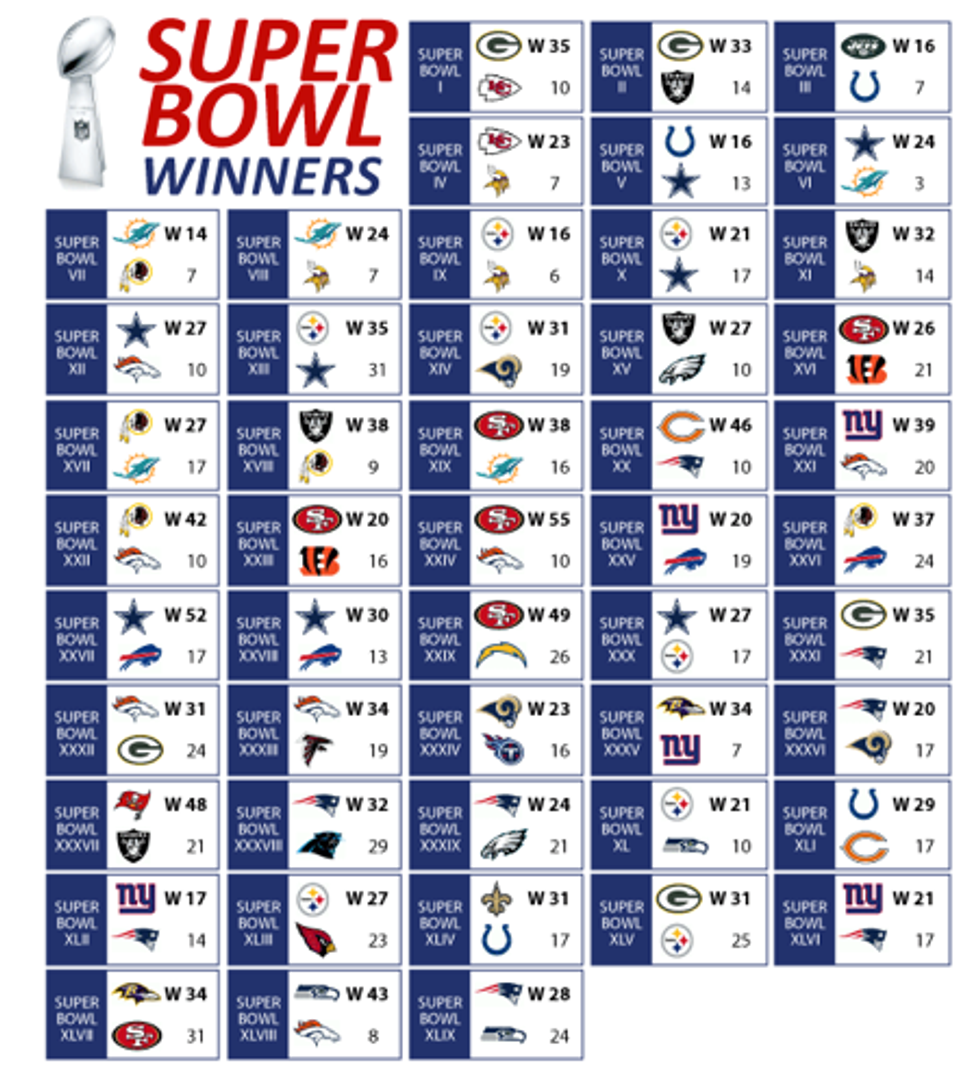 As of now, the NFC has won 26 Super Bowls compared to 23 wins from the AFC. The winner of the Super Bowl receives the Lombardi Trophy. It is named after former Green Bay Packers coach Vince Lombardi, who won the first (and second) Super Bowl. Here is a list of all the Super Bowl winners: