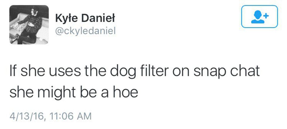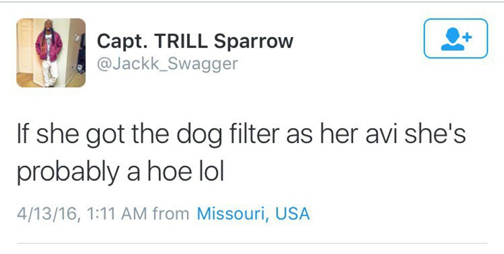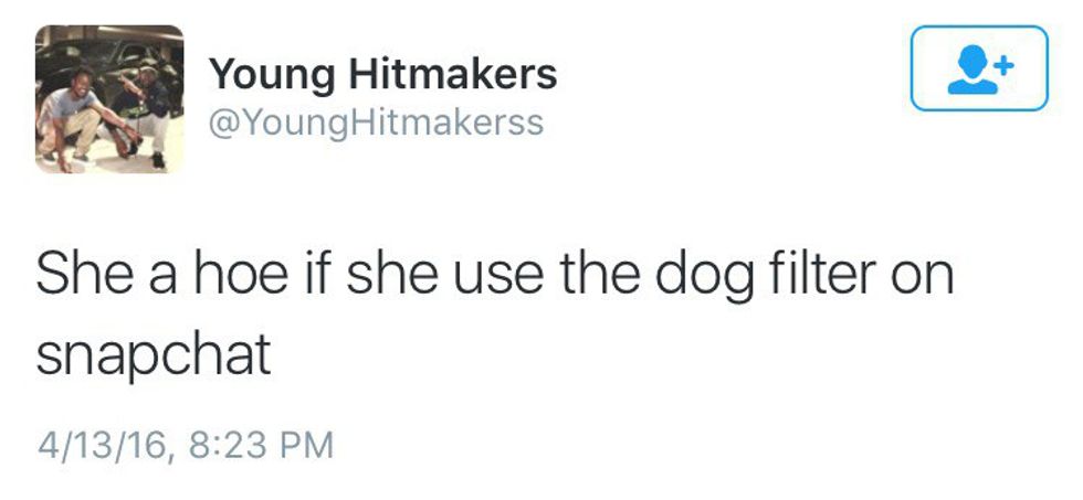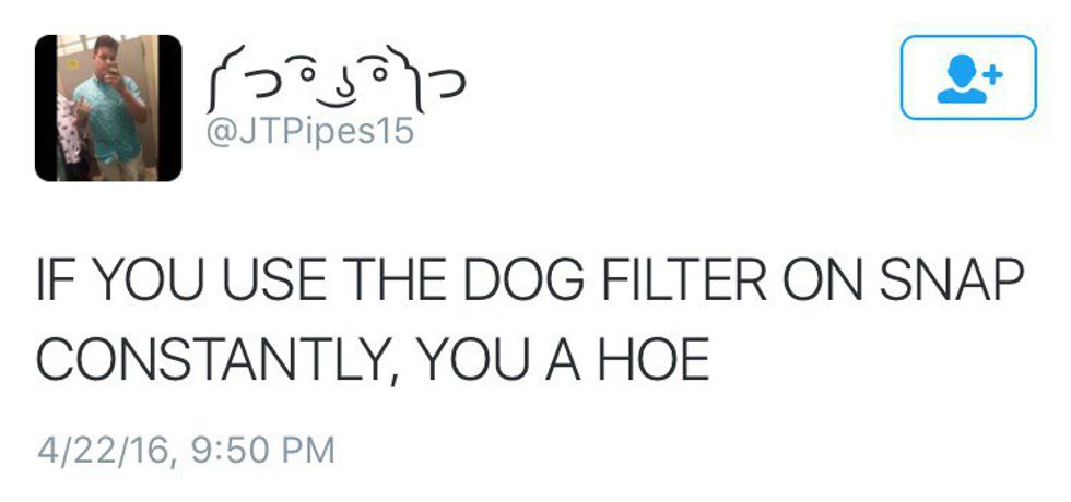 So, according to MANY boys on Twitter, using the dog filter on Snapchat indicates that a woman is a hoe. This has been said over and over again by heterosexual males, so it must be true! They have repeated this experiment many times, so this theory of the Dog Filter being a Hoe Filter has legitimacy. So men, if she uses the dog filter, then she a hoe.