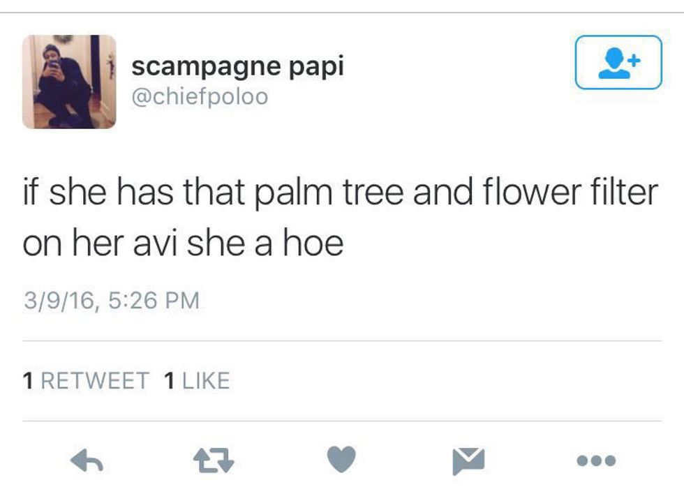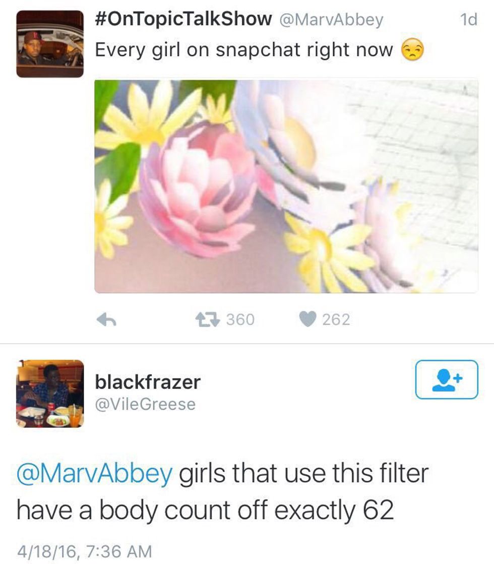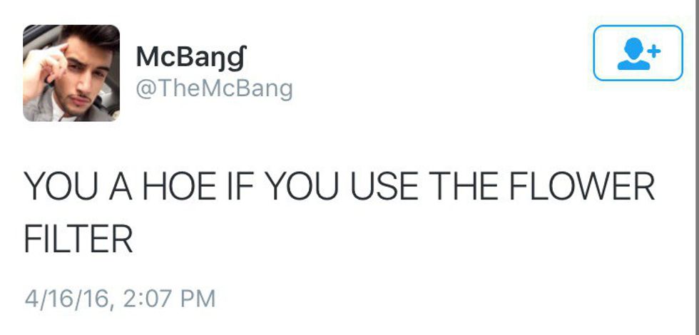 Apparently, this is taking over the Dog Filter as the new "hoe filter". But boys, don't be fooled. She still a hoe despite which filter she uses! Obviously, flowers imply that a girl sleeps around with boys. Therefore only whores use this filter.