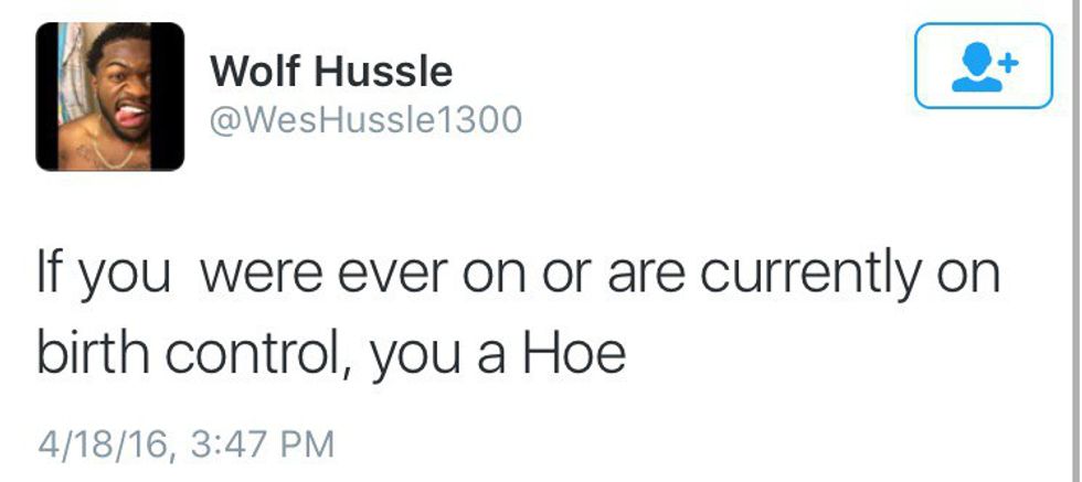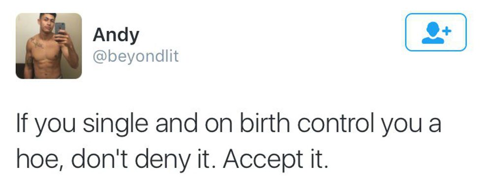 Even though birth control can help for a handful of reasons (i.e. getting rid of acne, regulating mensuration cycles, fighting certain cancers, helps those with anemia), a girl only uses it so she can hoe around. You know she's sleeping around with a bunch of dudes if she's taking birth control (despite the fact that she can be in a committed, loyal, monogamous relationship and still be on the pill). How dare she be prepared to have protected sex and save herself from unwanted pregnancies?