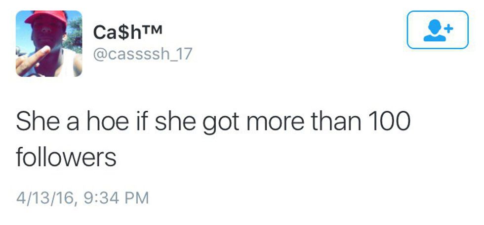 Speaking of impermeable logic, Ca$h has shown another sign of hoe-ability. If a girl has more than 100 followers on social media, you know it's all the guys she's sleeping with. When he was undeservingly called out for having over 100 Twitter followers, he provided an excellent argument (below).