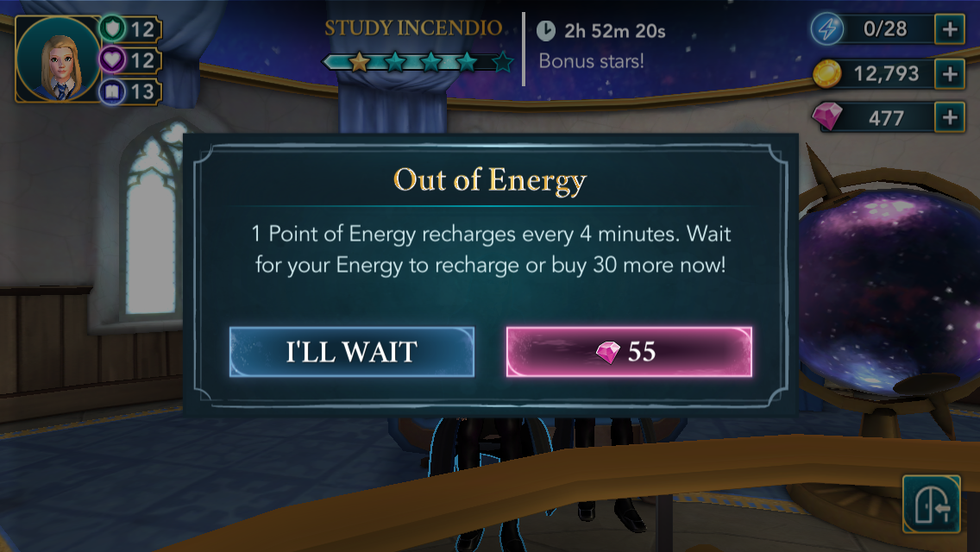 Sometimes you'll be in the middle of a class or a quest, trying to get enough stars to finish each activity but then you RUN OUT OF ENERGY! It's so frustrating and it takes four minutes to gain them back.