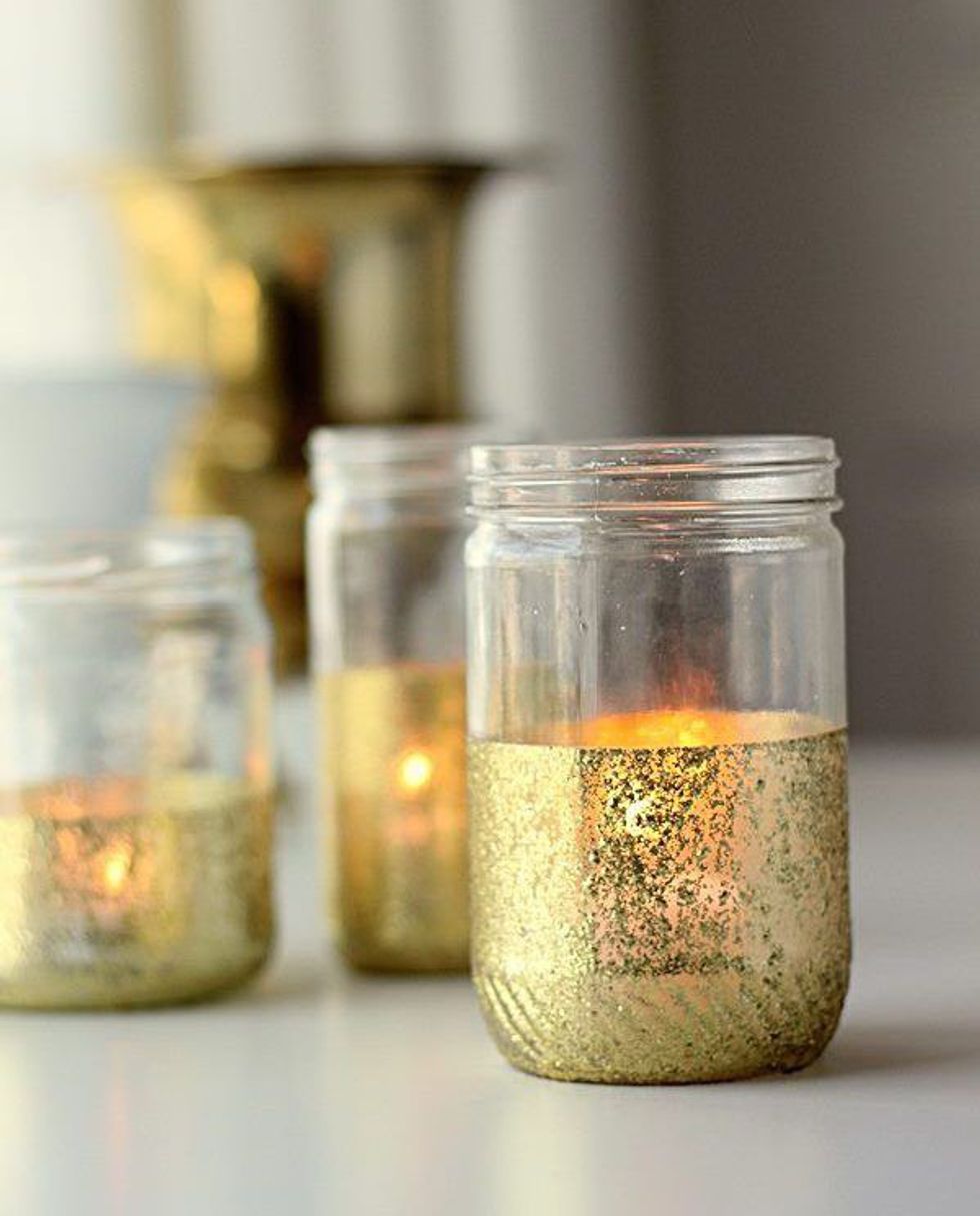 Grab some mason jars (or those handy Frappuccino bottles), paint the inside with clear glass paint, toss some loose glitter into the jar or bottle, seal it, shake it, and remove any extra glitter. Leave the jars out to dry before spicing them up with tea lights or led strings.