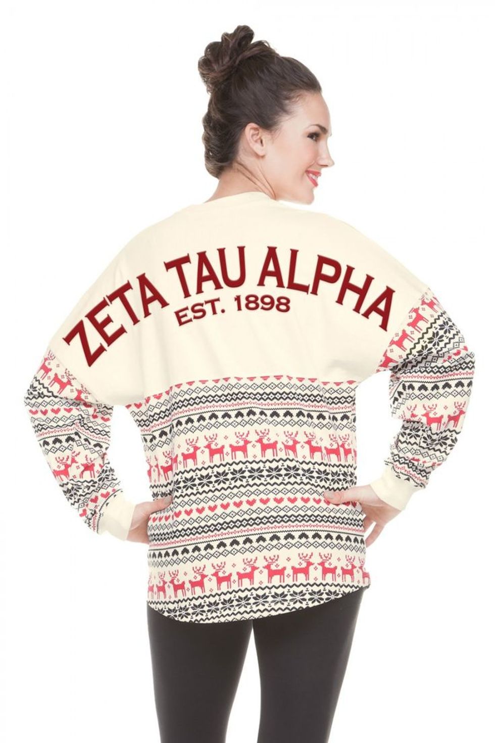 Spirit jerseys are practically a sorority girl essential. If you don't own a spirit jersey, how would anyone possibly know how much spirit you have!? This unique take on a traditional spirit jersey combines the comfy and cute fit of a regular spirit jersey with a holiday twist. It's the perfect sweater for when your Zeta wants to sit by the fire, drink eggnog, and surround herself with her loved ones.