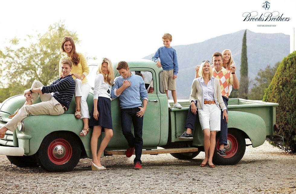 As a label that prides itself on creating high quality apparel that caters to a traditional, American lifestyle, Brooks Brothers targets a wide age range of consumers with one fundamental commonality: the desire to dress in a way that encompasses class and prestige. For many years, their demographic focused only on the wealthy male professional, typically between the ages of 25-50, as most of their revenue was generated through the sales of their tailored suits. Now, however, their brand has grown to also envelop the upper-class female, shopping for either herself or her children, as well as the preppy college student, who yearns for an Ivy-league look. As a high end retailer servicing such a large age range of clientele, Brooks Brothers relies on a mixture of print and social media advertising. Their ad campaigns portray their clothing as possessing quality present in classic American garments, back when things were “made better,” and also attests to their textiles being composed of comfortable yet luxurious fibers. Many of their print ads are set in black and white and include the phrase “generations of style,” to give the promotion a time-honored image that speaks to the everlasting style and dependability of their garments. Numerous Brooks Brothers’ summer advertisements shed light on the use of Supima cotton as being soft, durable, and color-rich; “the difference you can feel.” A noteworthy aspect of the label’s advertising is the incorporation of American manufacturing to build brand image. Garments that are produced in the United States are typically advertised as such, which is ironic, because Brooks Brothers imports much of its apparel from locations such as China. In terms of content, ads geared towards the older male consumer focus a lot on professional life, overviewing the importance of a well-tailored suit in the workplace. Women and children were pinpointed through more family-oriented campaigns, while the college-aged student was pictured in more active, collegiate settings. Overall, each advertisement released by Brooks Brothers was reflective of the preppy, patriotic lifestyle that cornerstones the brand.