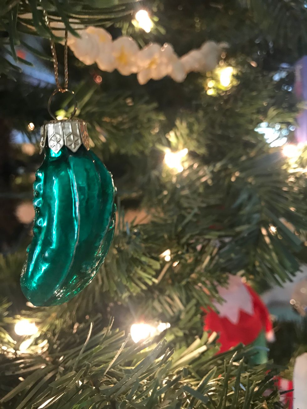 Alright, so the pickle ornament is a tale's old tradition that originated in Germany where a pickle would be hidden in the Christmas tree, and in our family at least, whoever finds it first gets an extra gift.