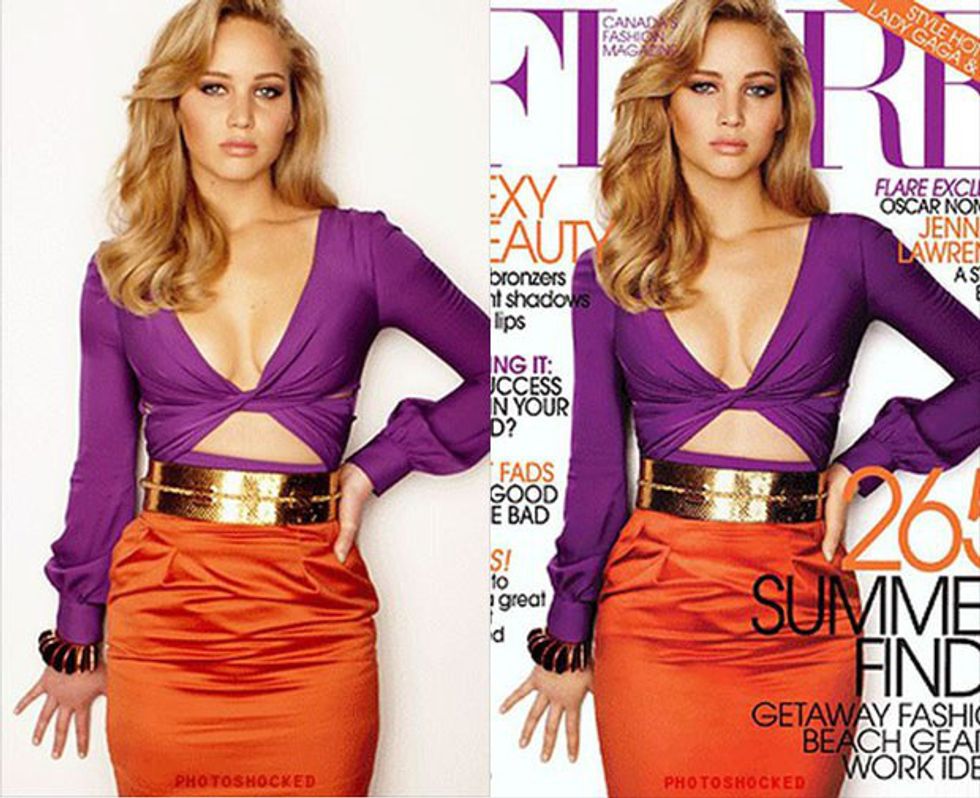 Lawrence has also had unfavorable encounters with retouched images of her face and body, such as her cover image on Flare magazine in June 2011. Despite her tough skin and positive attitude, the BAZAAR interview revealed some bitterness towards the Hollywood standard of female body image.