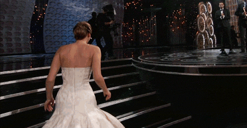 J-Law constantly trips up the stairs, drops her tray in the cafeteria, but always laughs it off.