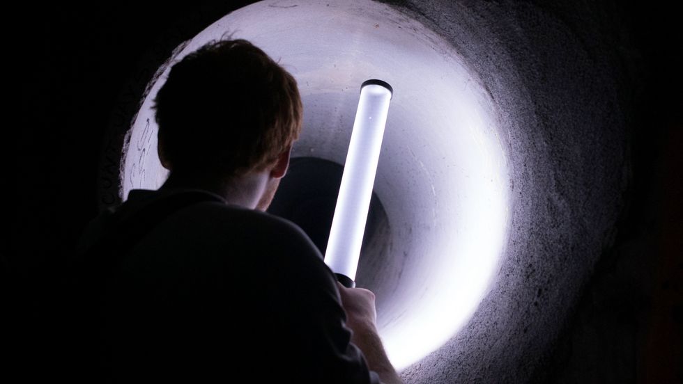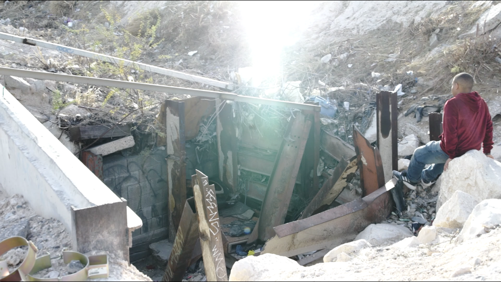 Packed with us were bags of food that we planned on giving to anyone we found in case our presence was less than welcomed.The first thing we noticed was a collection of personal items (chairs, sleeping bag, bottles, ect.) set up to be a home at the mouth of the tunnel. The space was uninhabited, so we went straight for inside the tunnel. The first thing you notice is the smell. It's pungent, in a moldy type of way, and the humidity increases slightly because of the presence of water. Only darkness lied ahead, so we turned on our light sticks, and continued to tread past items of minutia, graffiti, and stalactites of some unknown material. Eventually, the puddles of water grew in depth, and we were unable to continue. We didn't find the fabled, underground community, most likely because we did not travel far enough. Or maybe recent floods have forced the community to find shelter elsewhere? Regardless, we did find parts of it in other places.