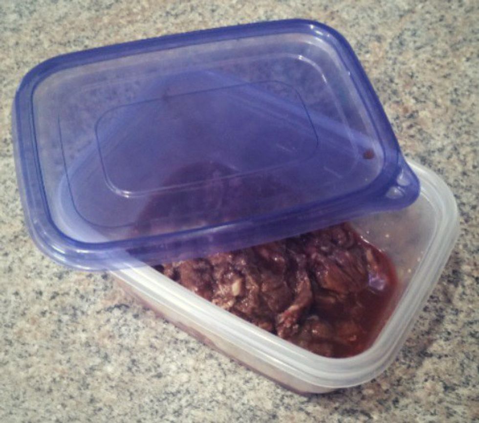 1. Remove the shredded beef from its container and dip each piece individually into the marinade, then put the marinated beef into the tupperware container. Make sure all of the beef gets coated as best you can. If you leave the shredded beef clumped up like it comes, not all of the beef will be marinated.