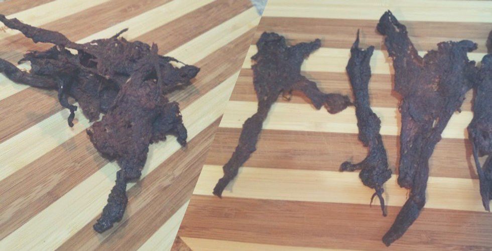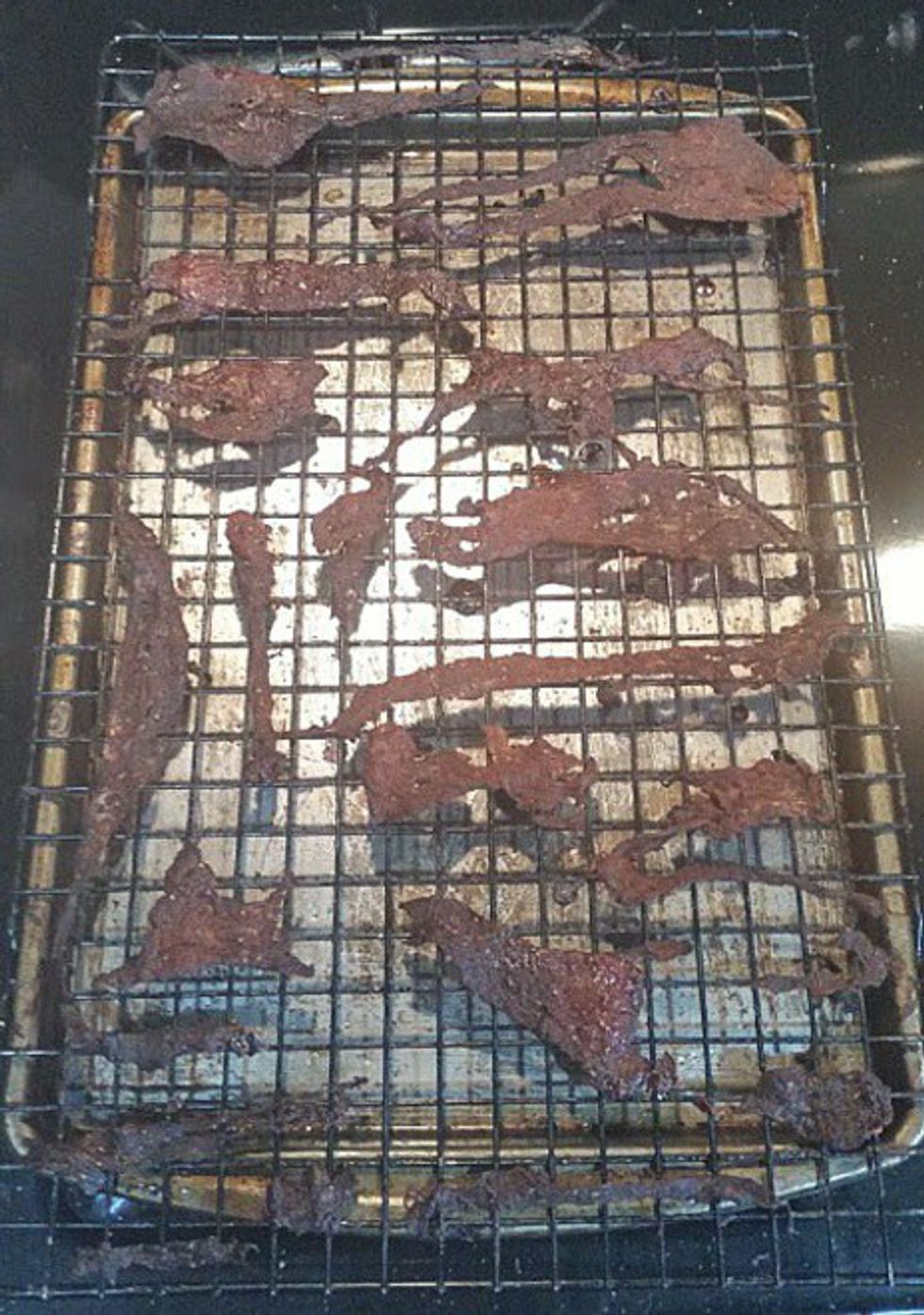 5. Put the beef on the drying rack that it attached to the cookie sheet. I have some drying racks that snap onto the cookie sheet that makes it super easy. The beef can be very close together, even touching, but I would not recommend overlapping pieces. Now is the time also to add a bit of salt, pepper, or what other spices you might want to add. Don't add too much here... the beef will shrink when it cooks and you don't want it to be over-salted.