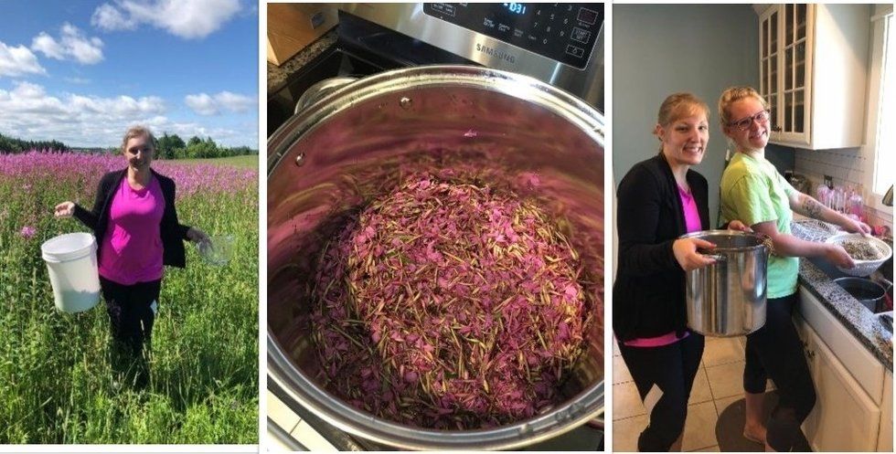 My cousin and I began the process by ATVing out to the front yard to gather the beautiful flowers. They key when gathering them is to strip the bud of all the flowers leaving only the green stem behind. We needed a lot of them so we began picking them as fast as possible. Fifteen minutes later we traveled back up to the house and began boiling the pot of fireweed.