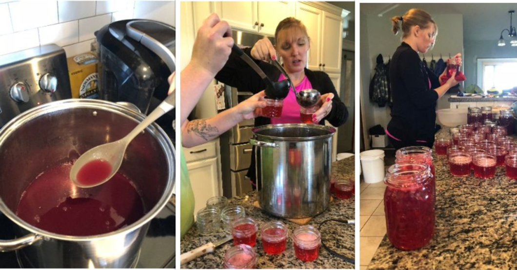Being so far up by the border of Canada everything is far apart. This drove us scrambling to the car for the half-hour trek to the nearest supermart. We nearly cleared the store out of pectin buying eight more packages but we rushed as fast as we could to get back to the jelly.