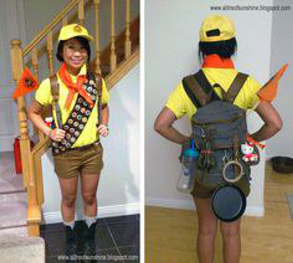 Being Russel for Halloween is probably one of the cutest and easiest costume. All you need is the yellow hat, yelow shirt and brown shorts (or leggings if it's cold). Than the sash which you can make yourself with felt and super glue.