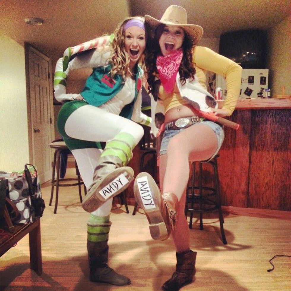 Woody and Buzz Lightyear can be a couple costume like above or you can go as either of them individually. Let's start with Woody; you definitely will need the yellow shirt and vest. Then for the pants, it can be shorts or longer pants depending on what your preference is. For Buzz, you need the white top and leggings with the green vest. On the bottom of the shoes you cannot forget to put Andy's name to complete the whole get-up.
