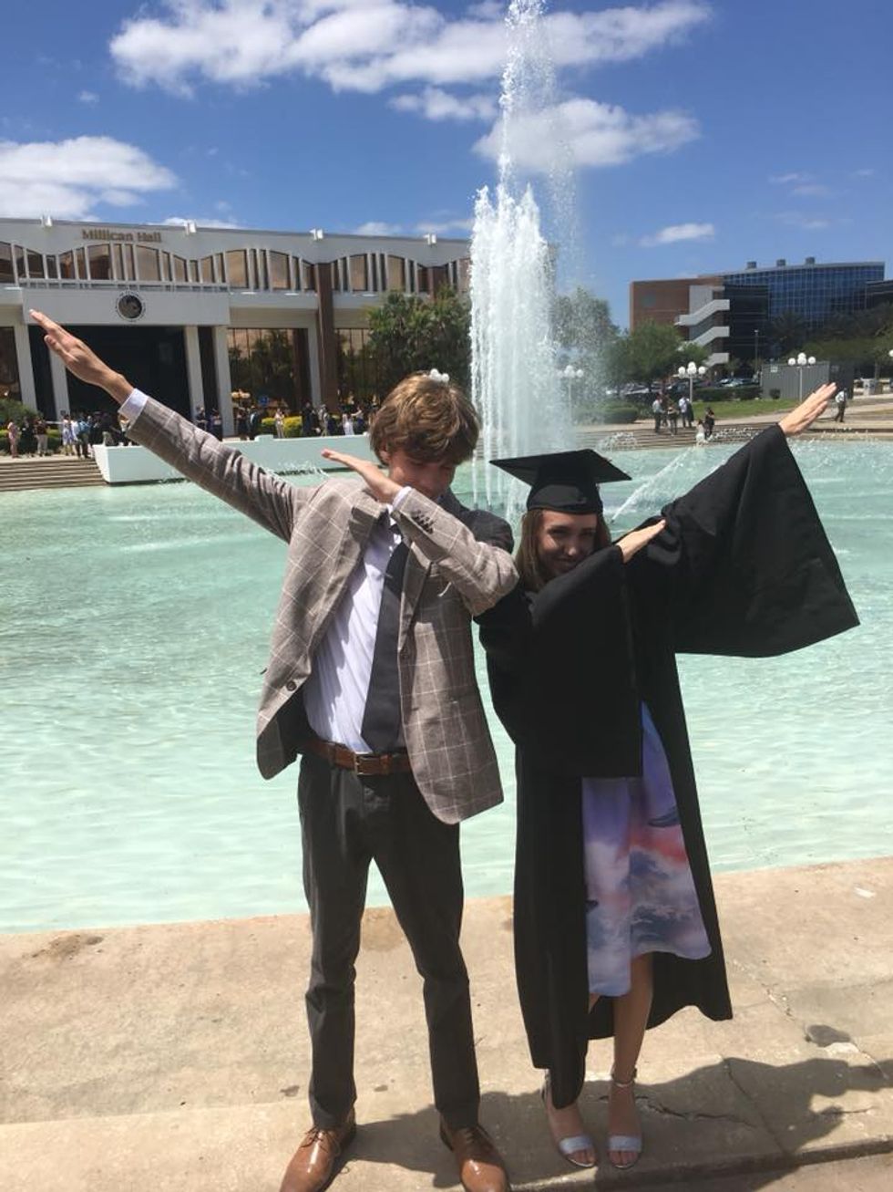 College graduation finally arrived. The line to pick up my university issued cap and gown was longer than my time there, it felt like. The gown was huge on me, but I was nevertheless excited. I decorated my cap with a quote from “Doctor Who”—“Let me be brave.” We were separated by our college categories but were allowed to sit in any order. I had only planned to sit with my best friend but was able to meet up with a few others I’d met that semester! The ceremony was much like my FPEA graduation, so I knew what to expect despite never being involved in a public or private school graduation.