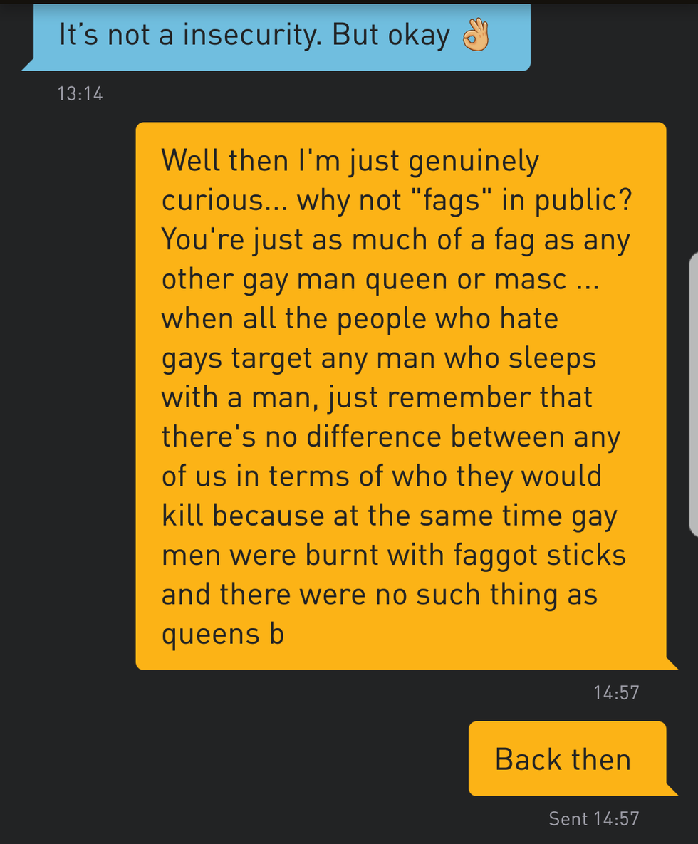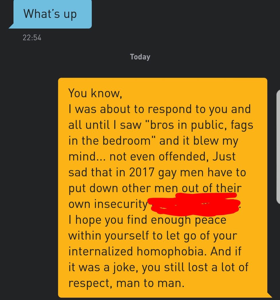 Honestly, at that point, I just became really bored and overall too lazy to go back and forth, so I ended it there. It had been one too many conversations like this, not even within Grindr but in real life as well and it's one too many.
