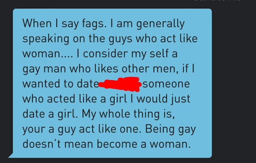The moment this faceless guy had to explain his reasoning behind the use of the word "fag", I felt a ball of fire catching on trees within the jungle I call my heart, wishing that it were his forest of intolerance burning instead.